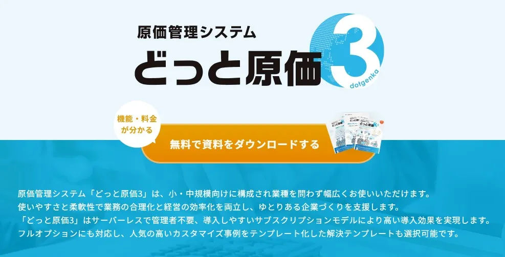| 価格 | どっと原価3(ライト):13,000円/月額~ どっと原価3(スタンダード):23,000円/月額~ |