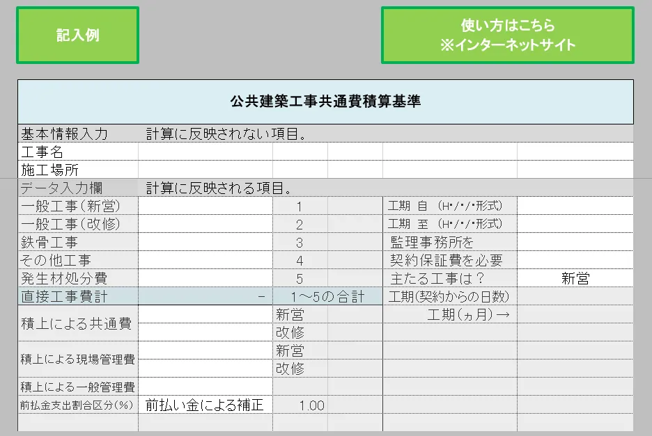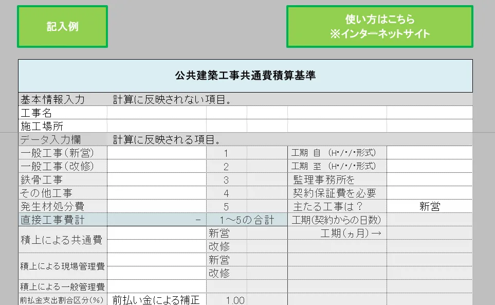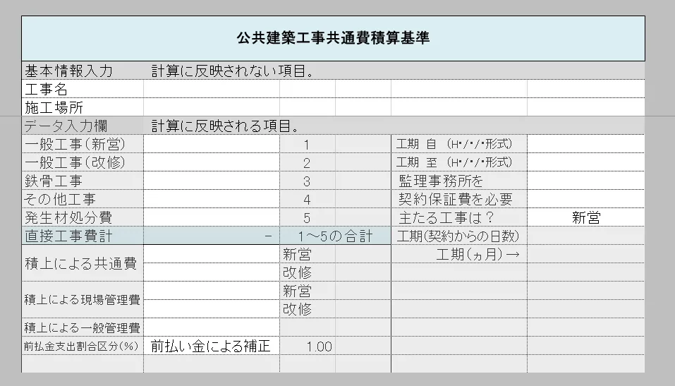 | 機能 | Excelを用いて、基本事項を入力するだけで、公共建築工事共通費(建築工事)を自動で計算できる |