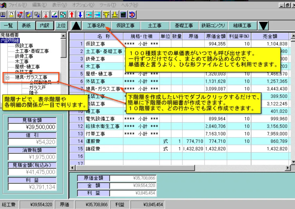 | 機能 | 手拾いに近い形式で、拾い書から集計表まで自動作成できる |