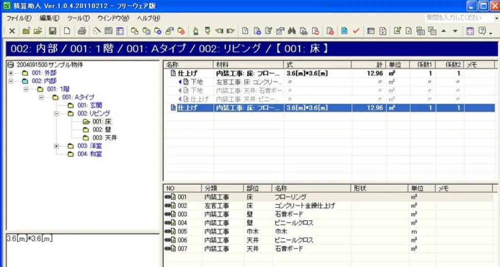 | 機能 | 建築物の内装工事積算用で、床、腰壁、壁、天井、巾木、回縁等の数量を算出できる |