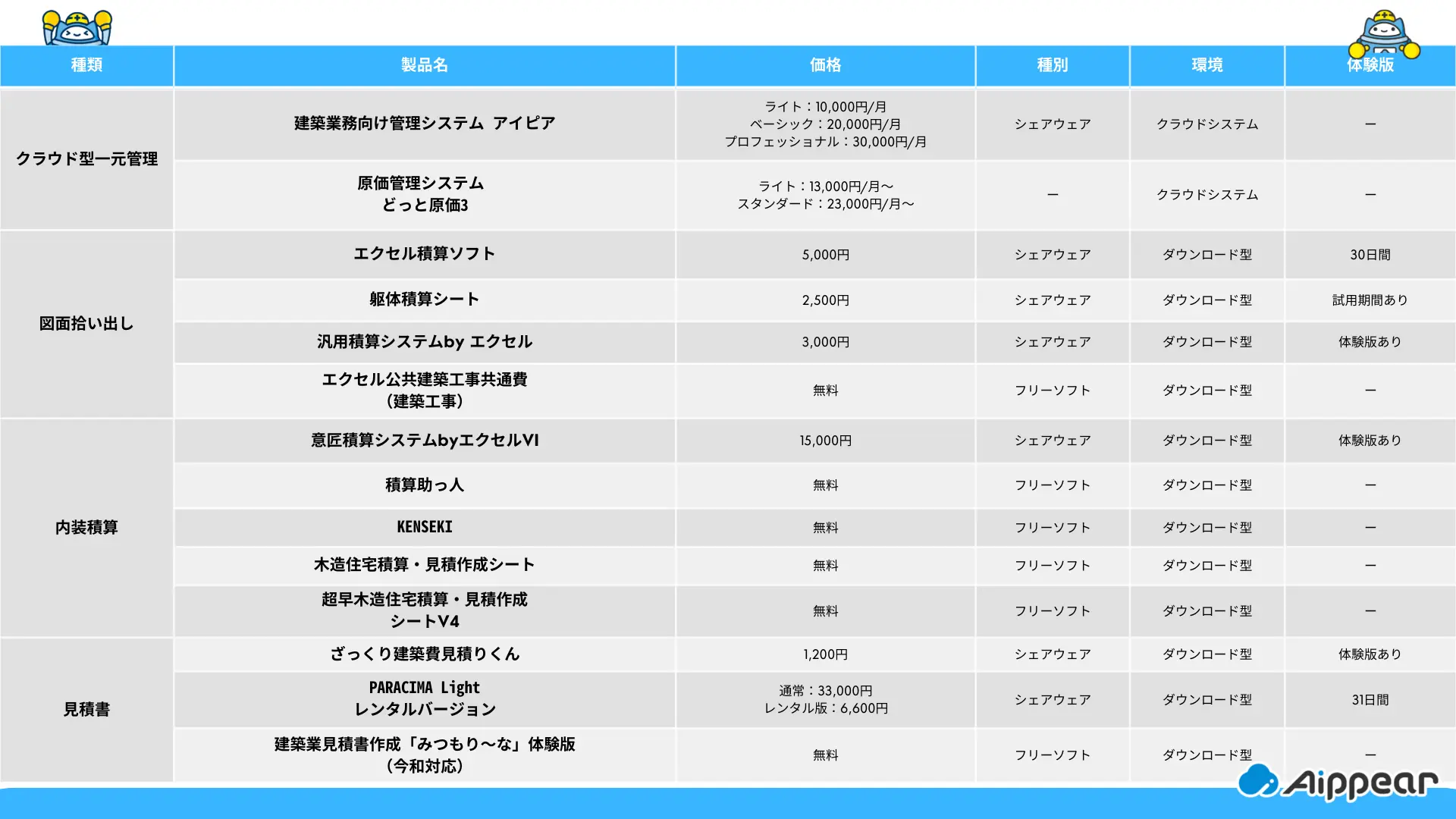 | 機能 | 手拾いに近い形式で内外部・建具の積算ができる |